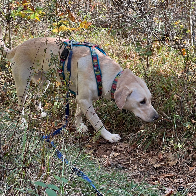 Ein Brustgeschirr und eine lange lockere Leine ermöglichen dem Hund ausreichend zu schnüffeln.