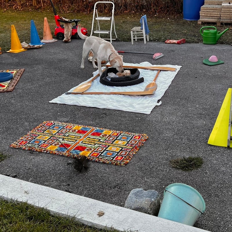 Wir nehmen uns Zeit für Nasenarbeit (ausreichendes Schnüffeln und Finden von Leckerlis) und Übungen zur Stärkung der Muskulatur.